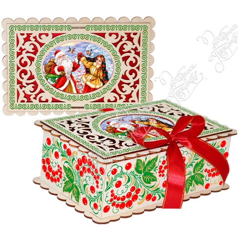 Подарок упакован в красочный пакет с новогодней символикой.