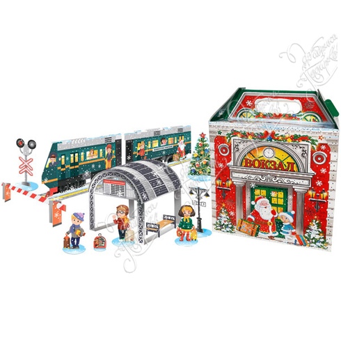 Дедушка Мороз не может отвезти подарки без твоей помощи. Достань содержимое из коробки, построй железнодорожный вокзал и поезд, чтобы Дед Мороз со Снегурочкой успел до Нового года поздравить других детишек.