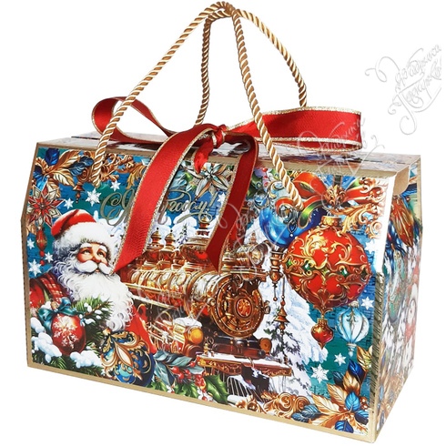 Микрогофрокартон, rрасная атласная лента с золотым краем, многоцветное тиснение, микроглиттер, ручки из шелка.