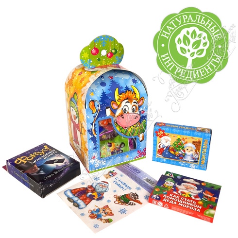 Состав: Фанты "Как стать помощником Деда Мороза"60р, Пазл детский «Новогодние картинки», 54 элемента 15р, Наклейка со светящимся слоем 17р, Фокус, Пастилки фруктовые без сахара- 5шт.