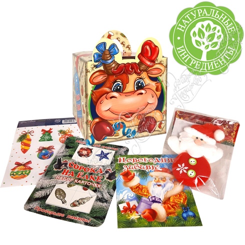 Разнообразное наполнение упаковано в качественную картонную коробку. На упаковке изображена милая коровка. Картон, покрытый УФ-лаком, защищает содержимое от выцветания, загрязнений и порчи. А яркое оформление выделяет подарок на фоне других.
