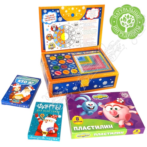 Состав: Игра «Кто Я?», Фанты, Пластилин 8 цветов, Пастилки фруктовые без сахара- 5шт.