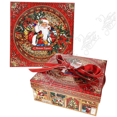 Дизайн этой волшебной коробочки выполнен в стиле старинных рождественских открыток. Коробочка из футлярного картона дополнена лентой из красного шелка. Золотое тиснение. Подарок упакован в красочный